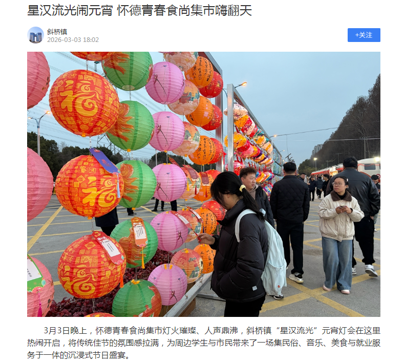 据了解,怀德青春食尚集市是斜桥镇打造的特色惠民项目,此次“星汉流光”元宵灯会,不仅是一场传统佳节的庆祝活动,更是斜桥镇关爱青年、服务人才的生动体现。斜桥镇还将继续依托这一平台,推出更多丰富多彩的活动,为青年群体营造更有温度、更具活力的生活与发展环境。