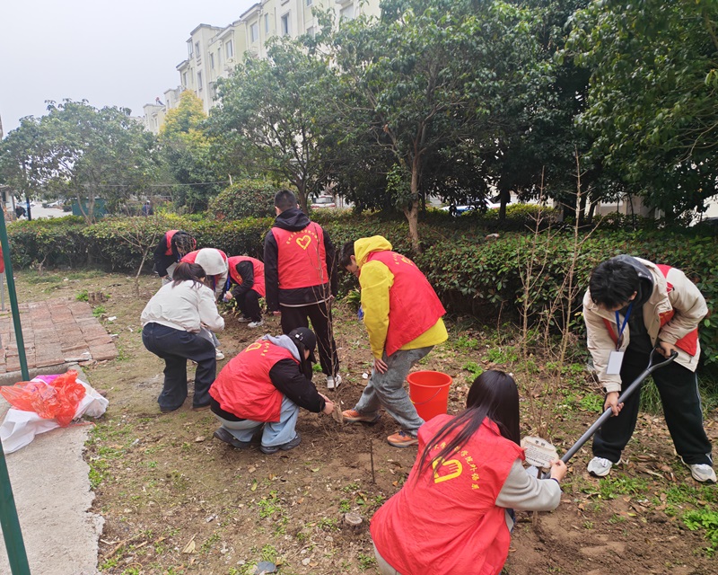 活动现场,志愿者们精神饱满、干劲十足,在社区工作人员的引导下,迅速明确分工、默契协作,有序投入到植树工作中。大家手持铁锹、水瓢等工具,严格按照植树规范,完成挥锹挖坑、扶正树苗、培土压实、提水浇灌等每一道工序。经过同学们的辛勤劳作,一株株新栽的树苗迎风挺立、绿意盎然,为初春的社区增添了勃勃生机,也用青春汗水为生态环境保护贡献了高校力量。