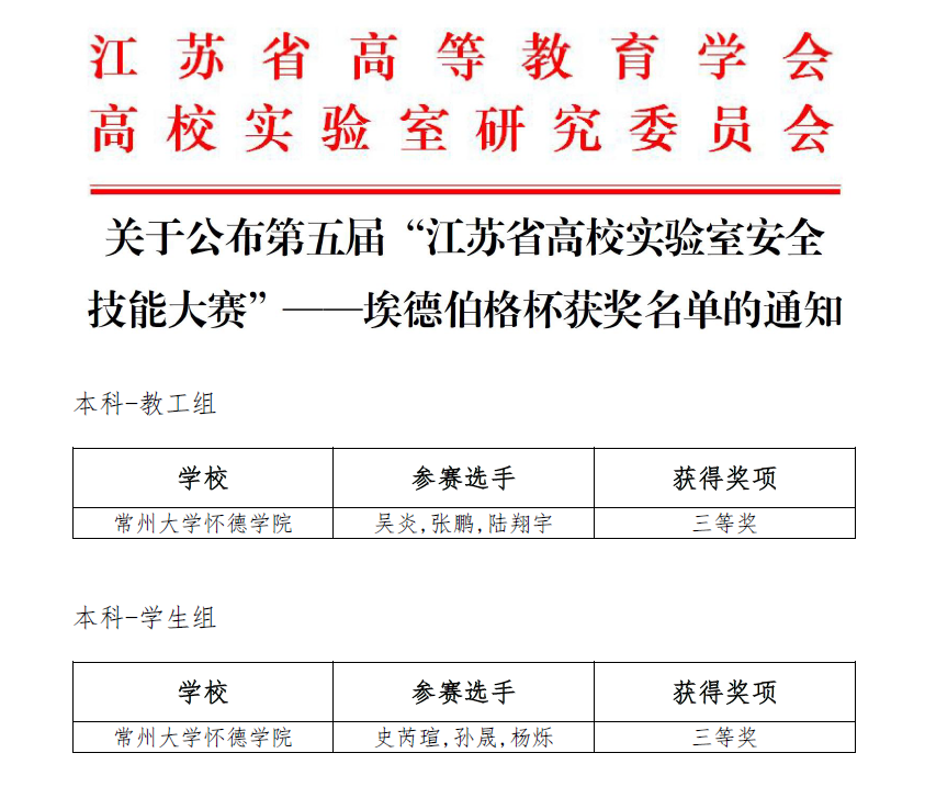 近日,第五届“江苏省高校实验室安全技能大赛”在南通大学举行。我院师生代表队在全省74所高校、111支队伍中表现突出,双双荣获三等奖。