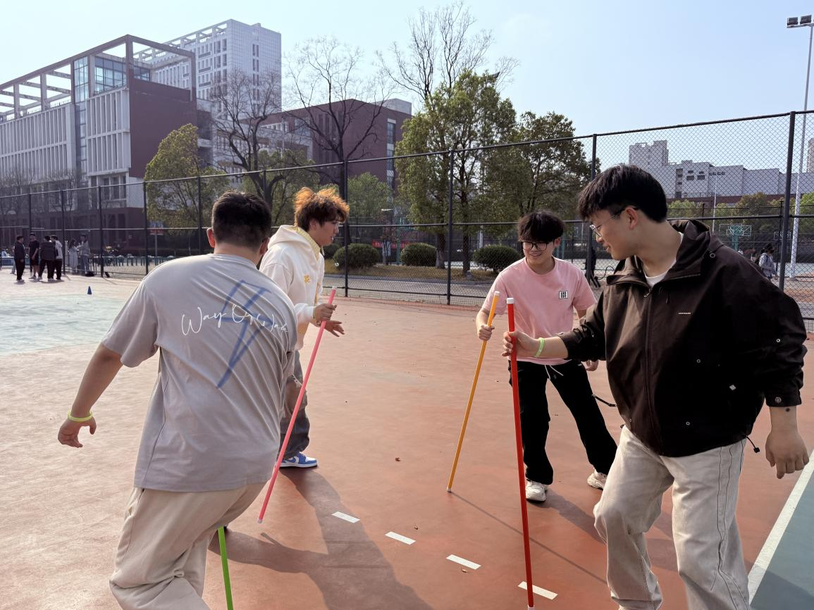 本次活动设置了“绳舞飞扬”、“同心并行”、“不倒森林”和“轨道传球”四个项目,兼具协作性与趣味性。同学们自行组建四人小队,依次进行挑战。活动现场气氛热烈,队员们默契配合,展现出青春的活力与并肩前行的温情。