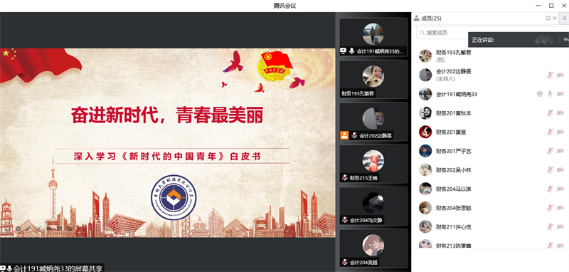 会议开始,朱雯雯首先介绍了白皮书的四大章节:《新时代中国青年生逢盛世、共享机遇》、《新时代中国青年素质过硬、全面发展》、《新时代中国青年勇挑重担、堪当大任》与《新时代中国青年胸怀世界、展现担当》,随后朱雯雯将这四个章节分别分为若干的知识点,并通过举例对其进行详细的讲解。最后,她强调,中国的未来属于青年,世界的未来也属于青年,我们要深刻理解白皮书的实际意义,从中汲取精神信念,学习新时代青年人所肩负的使命与担当。