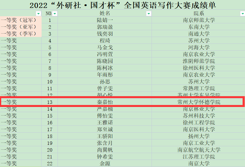 10月29日,2022“外研社·国才杯”英语阅读、写作大赛江苏省复赛圆满结束。经过激烈角逐,我院英语系19级学生秦嘉怡荣获写作省级一等奖,创下我院英语竞赛该项目的历史最好成绩;会计系20级学生曹月荣获写作省级三等奖,机材系20级学生彭沛诗等其他四位同学分别荣获阅读、写作省级优胜奖。