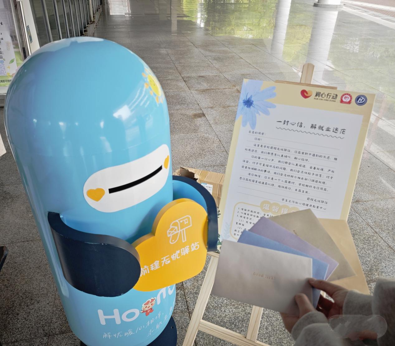 为有效缓解学子求职过程中的焦虑与迷茫,切实做好学生心理帮扶工作,学院心理健康教育中心精心策划了“一封心信,解就业迷茫”主题活动。4月17日,院心理自助中心在二食堂门口开展了“前程无忧驿站”邮筒展出与活动宣传工作,为奔波求职的同学们介绍活动详情、搭建心灵沟通的初步桥梁。