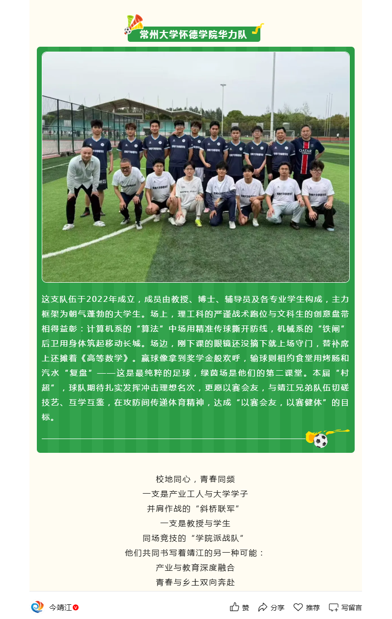 常州大学怀德学院华力队于2022年成立,成员由教授、博士、辅导员及各专业学生构成,主力框架为朝气蓬勃的大学生。场上,理工科的严谨战术跑位与文科生的创意盘带相得益彰:计算机系的“算法”中场用精准传球撕开防线,机械系的“铁闸”后卫用身体筑起移动长城。场边,刚下课的眼镜还没摘下就上场守门,替补席上还摊着《高等数学》。赢球像拿到奖学金般欢呼,输球则相约食堂用烤肠和汽水“复盘”——这是最纯粹的足球,绿茵场是他们的第二课堂。本届“村超”,球队期待扎实发挥冲击理想名次,更愿以赛会友,与靖江兄弟队伍切磋技艺、互学互鉴,在攻防间传递体育精神,达成“以赛会友,以赛健体”的目标。