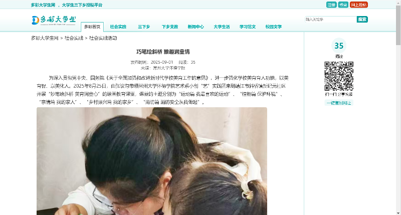 为深入贯彻党中央、国务院《关于全面加强和改进新时代学校美育工作的意见》,进一步强化学校美育育人功能,以美育智、以美化人。2025年8月25日,由张议匀带领常州大学怀德学院艺术系小创“艺”实践团来到靖江市斜桥镇新纪元社区开展“妙笔绘斜桥 美育润童心”的绘画教育课堂,课堂的主题分别为“运动篇 我最喜欢的运动”、“植物篇 保护环境”、“亲情篇 我的家人”、“乡村振兴篇 我的家乡”、“消防篇 消防安全从我做起”。