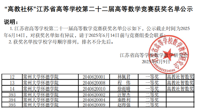 我院学生在江苏省第二十二届大学生高等数学竞赛中喜获佳绩