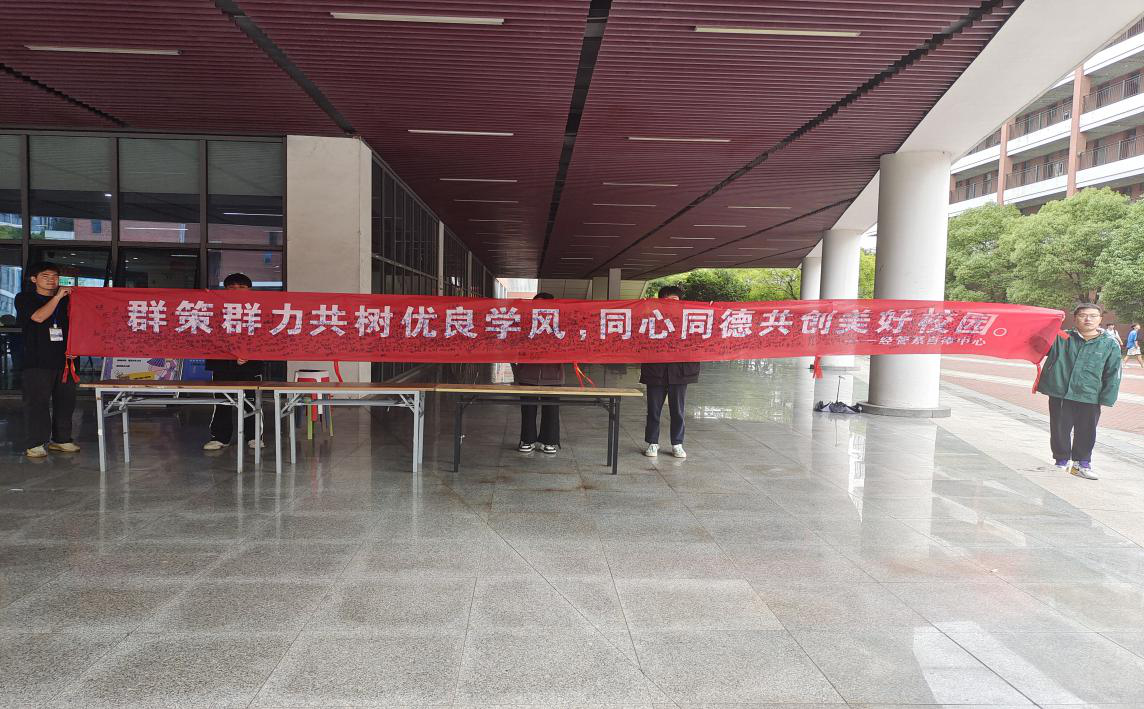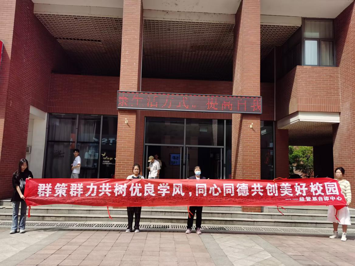 为了进一步加强学风建设,帮助学生养成良好的学习习惯。5月22日,经济管理系自律中心于二食堂和学生公寓门前开展了学风建设月“优良学风进公寓”横幅签名活动,同学们积极参加。