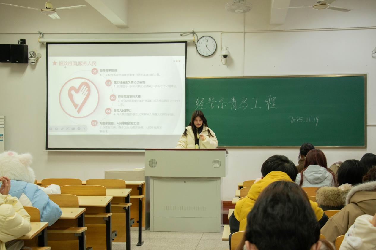 首先,经管系青年志愿者协会会长冯润琳深入解读了志愿精神引领新时代青春力量的重要意义,鼓励同学们主动投身国家建设、自觉践行社会主义核心价值观。随后,冯润琳通过分享参与公益活动、关注弱势群体、树立生态文明理念等志愿实践案例,生动展现了志愿服务的精彩纷呈。最后,冯润琳详细阐述了青年学子在日常生活中应如何践行志愿精神,于奉献中实现自我价值,以青春行动书写无愧于时代的精彩答卷。