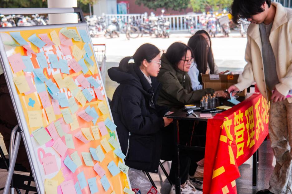 为引导学生正确认识并真诚接纳自我,有效缓解内耗与焦虑情绪。3月27日中午,经济管理系于学校二食堂门口成功举办“心语墙·爱的自留地——百种爱己方式留言展”主题活动,经管系学生踊跃参与。