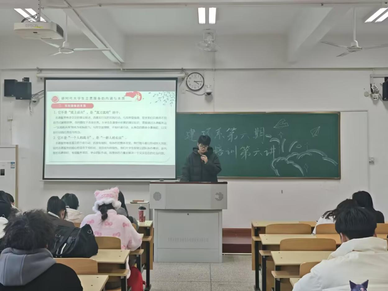 为深化青马学员对志愿服务的认知,引导学员践行青年担当,提升志愿实践能力。建环系于11月28日在A101开展了青马工程培训第六讲大学生志愿服务建设暨新思想公开课。本次培训由建环系青协会长梁朝晨主讲,建环系全体青马学员参与。