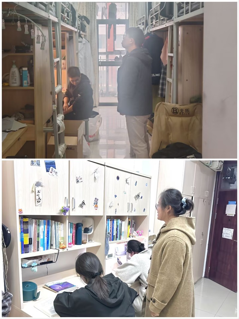 在走访过程中,辅导员们重点检查了宿舍卫生:多数宿舍干净整洁,物品有序、床铺平整,展现出良好的生活自律性;个别宿舍存在卫生死角、垃圾堆积、物品杂乱等问题,辅导员已现场与相关同学沟通整改。同时,本次走访也聚焦用电安全,辅导员仔细核查电器使用情况,提醒同学们严禁使用热得快、电暖器等违规电器。