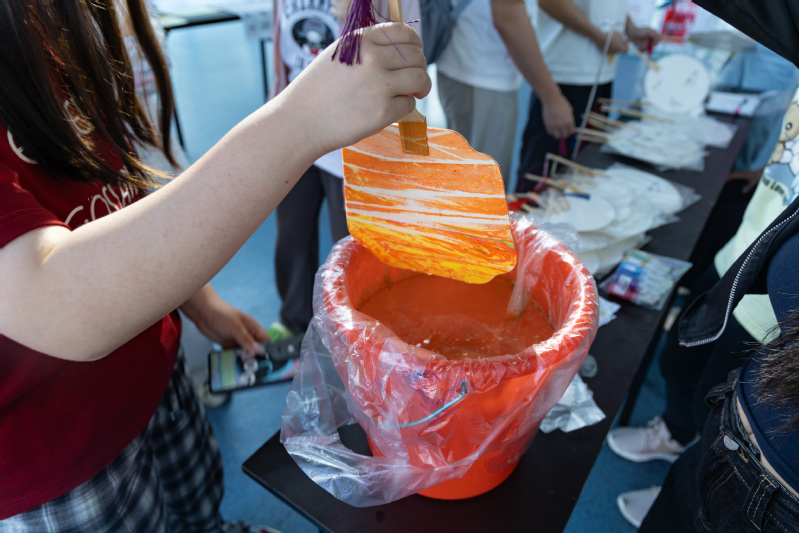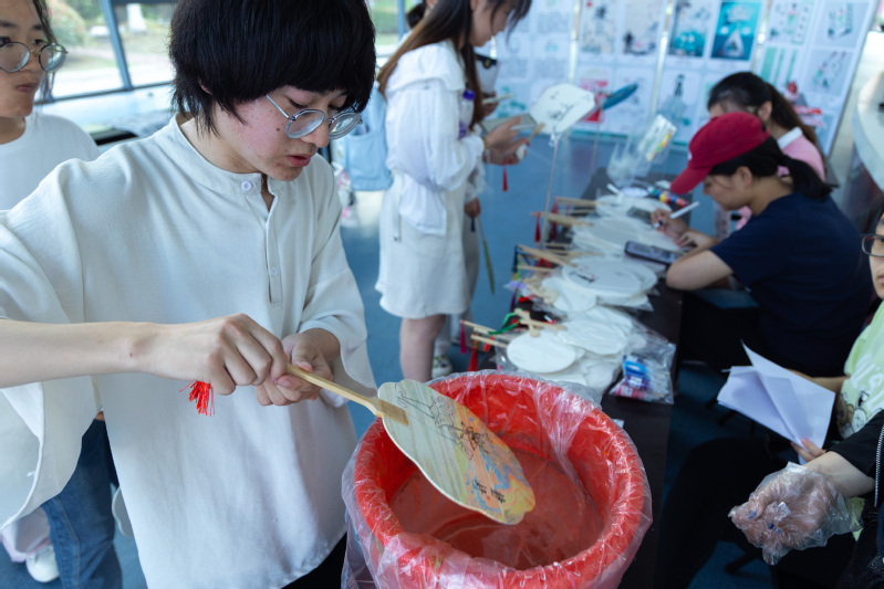 展厅一角还布置了漆扇制作区,桌上摆放着各种制作漆扇所需的材料和工具,如未上漆的扇子、不同颜色的漆料、画笔等。活动开始后,师生们纷纷排队参与,认真地在扇面上绘制图案、书写廉洁标语。