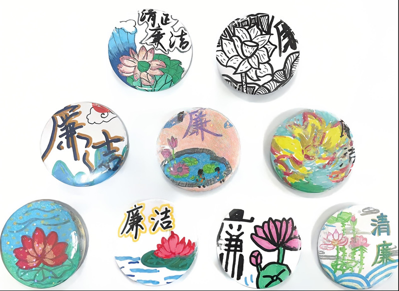 活动现场,同学们领取空白徽章材料和彩笔,围绕“廉洁”主题展开创作,同学们将莲花、竹子、清风、天平等象征清廉的元素融入徽章创作,用巧思传递“青春守廉”的承诺。这些作品不仅展示了学生们的艺术才华,还生动诠释了同学们对廉洁文化的理解和感悟,充分体现了学生们对廉洁文化的真情实感,让每枚徽章成为流动的廉洁文化名片。