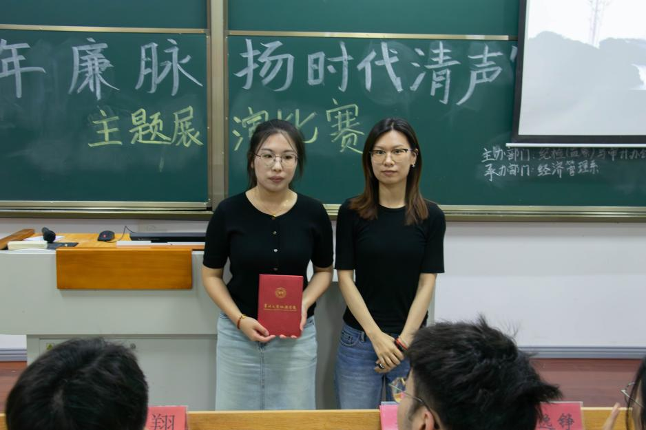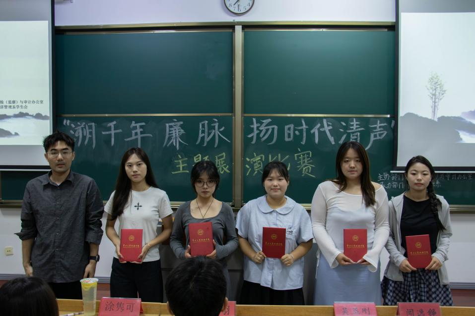 为深植廉洁理念,赓续千年廉脉,强化大学生廉洁自律意识。5月26日晚,经济管理系成功于J105教室举办“溯千年廉脉,扬时代清声”主题展演比赛决赛。本次比赛由院纪检(监察)与审计办公室涂隽可、综合办公室徐乐乐、经管系党总支副书记周翔、组织员吴玉刚和团总支书记闻逸铮担任评委,全院学生踊跃参加。