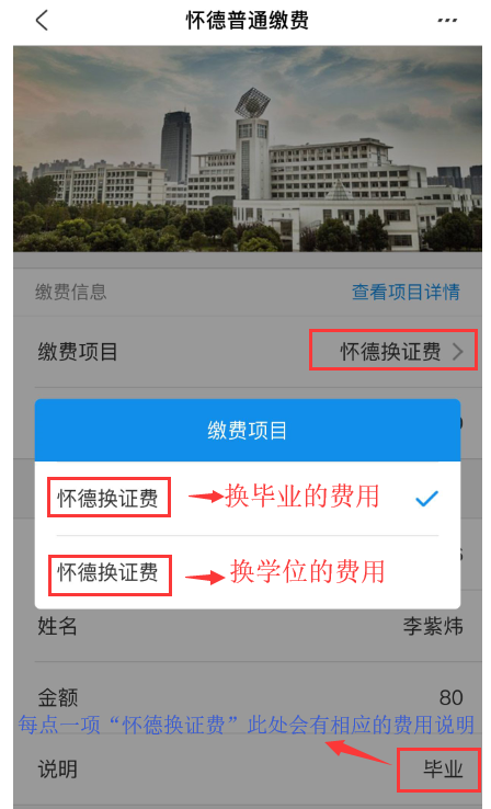 3.同时申请换毕业证书和学位证书的学生需要在缴费项目里分别交“换毕业的费用”和“换学位的费用”。只有同时申请换毕业证和学位证双证的同学以下缴费界面才可选;只申请单证的同学以下界面不可选,直接缴费即可。