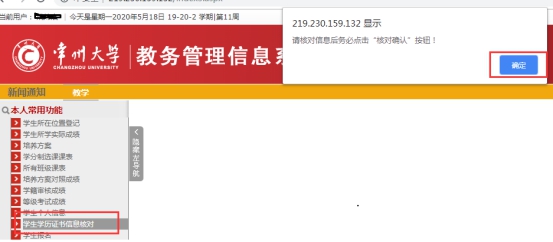 1、登录学校门户(门户登录链接),进入教务管理信息系统,导航栏中“本人常用功能”-“学生学历证书信息核对”,阅读弹窗提示后点击窗口提示中的“确认”按钮。