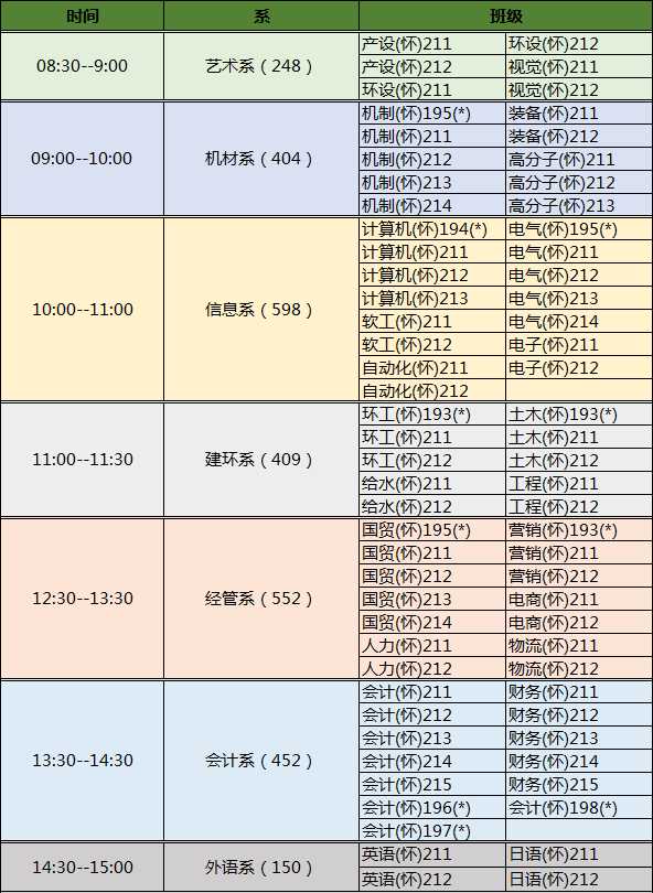 (3)拍照以班级为单位,由班长或小班带队,维持好现场秩序,不要大声喧哗,在安排表中拍照时间段内,提前组织好班级(全班)人数的优先拍摄,由小班或班长联系现场调度人员确定拍照教室。(全班按学号从小到大排一列纵队);