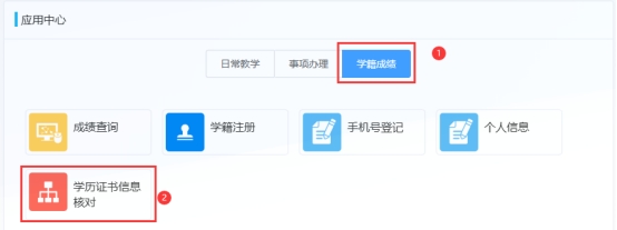 1.登录教务系统(校外可通过企业微信访问教务系统)---应用中心---学籍成绩---学历证书信息核对,如下图: