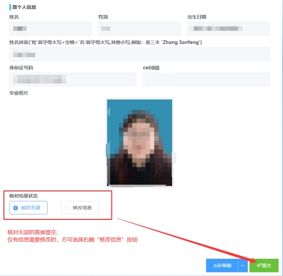 经核对,信息无误的,请直接“提交”,若需要修改信息的,请选择“修改信息”按钮,在相应栏内按格式输入正确的信息,点击“提交”。如下图: