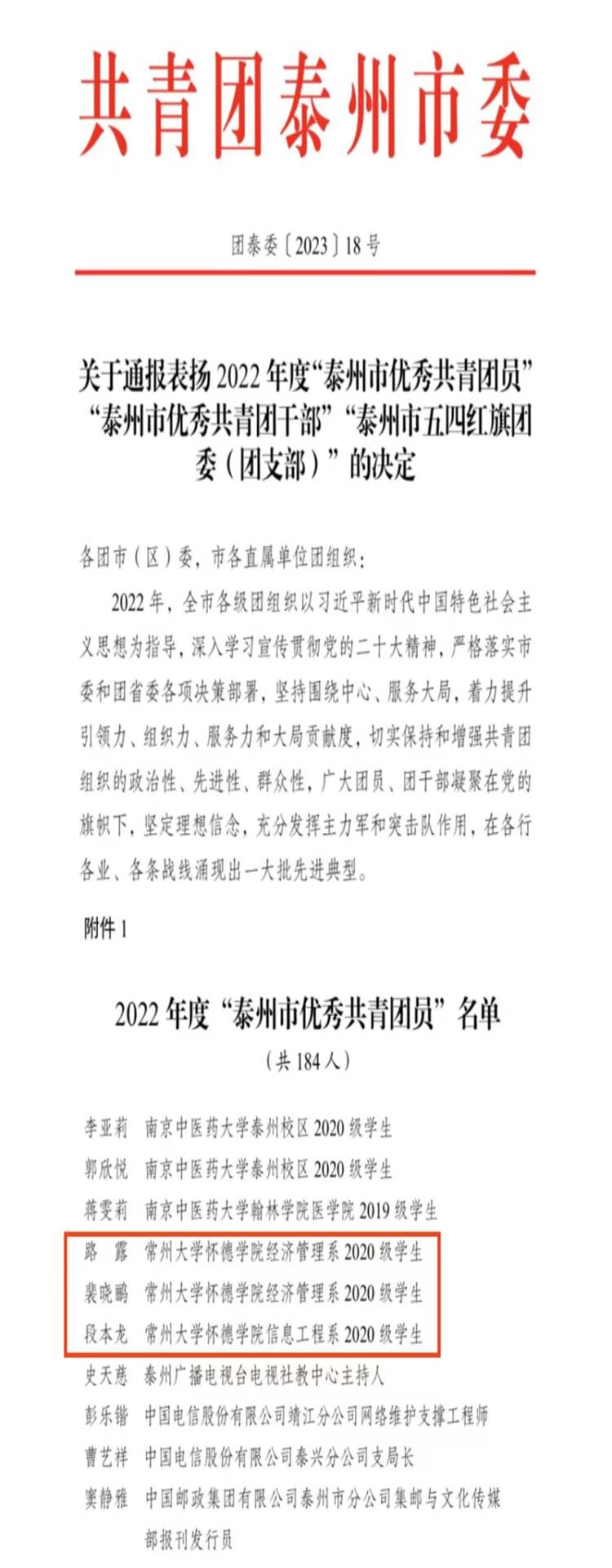 近日,共青团泰州市委员会对共青团各项重点工作进行表彰,我院共青团员喜获荣誉。 在团市委组织开展的2022年度“泰州市优秀共青团员”、“泰州市优秀共青团干部”、“泰州市五四红旗团委(团支部)”的评选评优中,我院路露、裴晓鹂、段本龙三位同学荣获“泰州市优秀共青团员”称号。 2022年,我院团委深入学习宣传贯彻党的二十大精神,严格落实市委和团省委各项决策部署,推进学生组织改革,提升了基层学生组织活力和青年团员的参与热情。2023年,我院要更加紧密地团结在以习近平同志为核心的党中央周围,深入学习贯彻习近平新时代中国特色社会主义思想,深刻领悟“两个确立” 的决定性意义,不断增强“两个维护”的思想自觉、政治自觉、行动自觉,牢记习近平总书记对新时代中国青年和共青团的希望要求,为我院建设现代化本科院校贡献青春力量。(通讯员/谷灵莉)