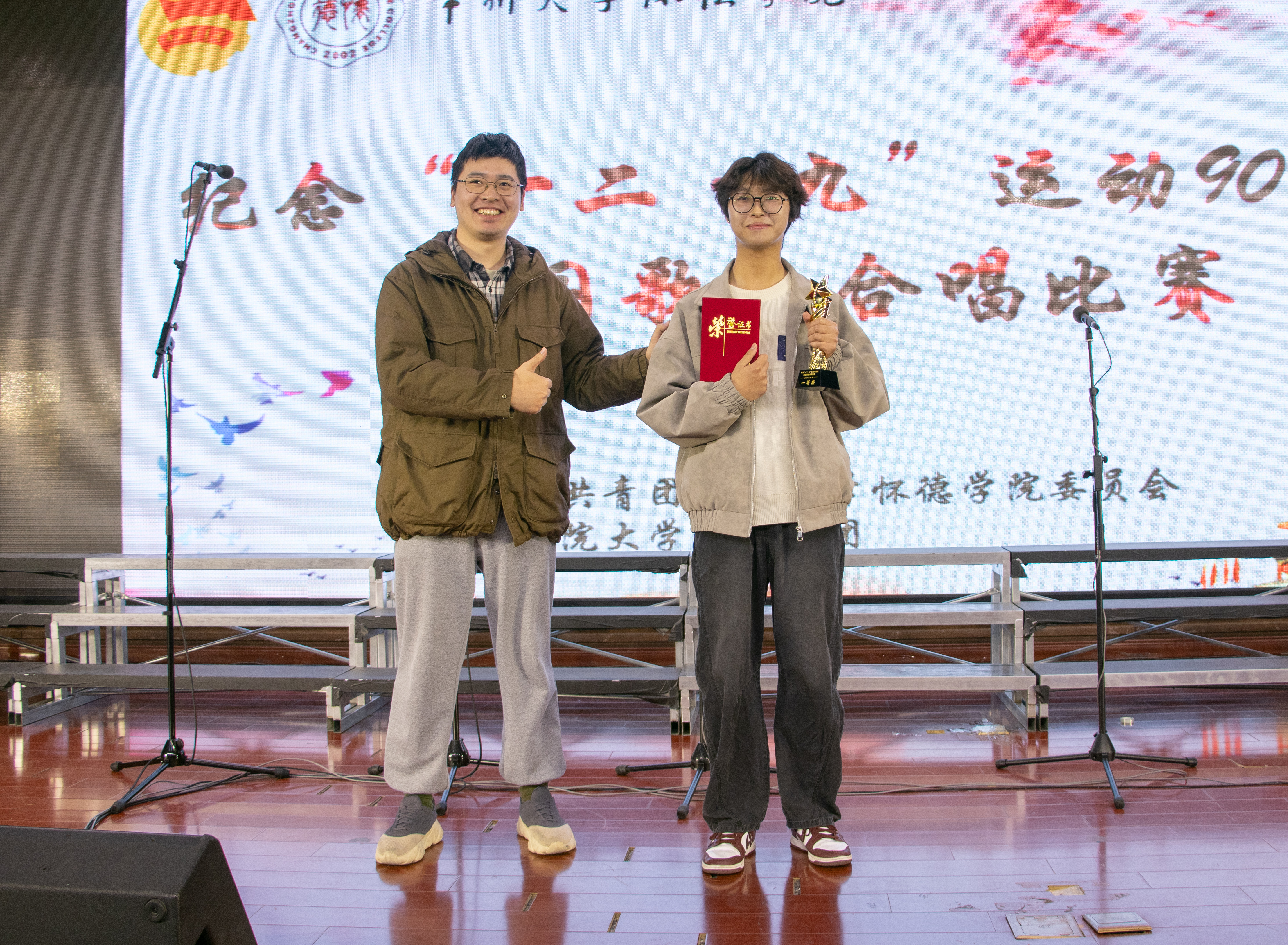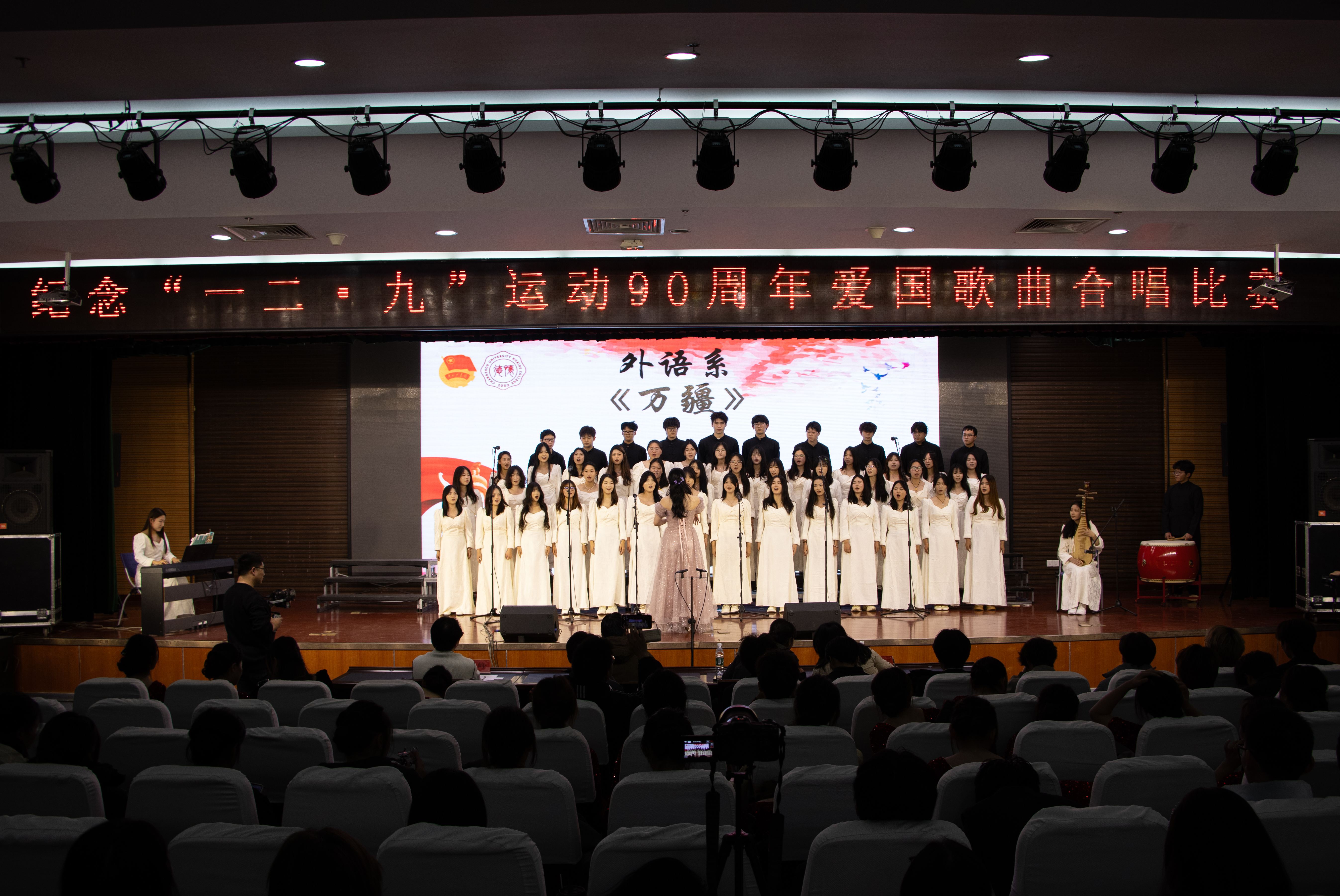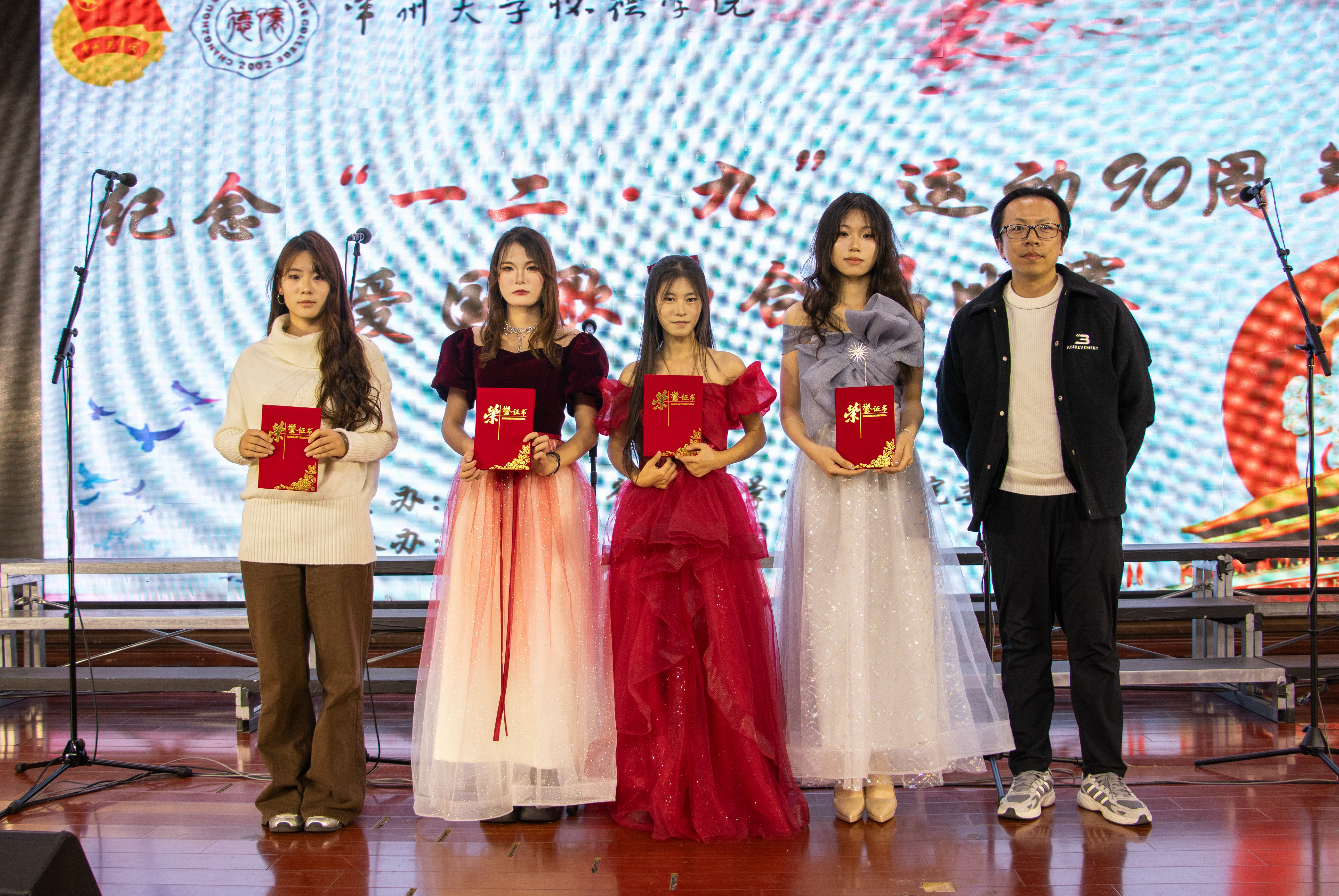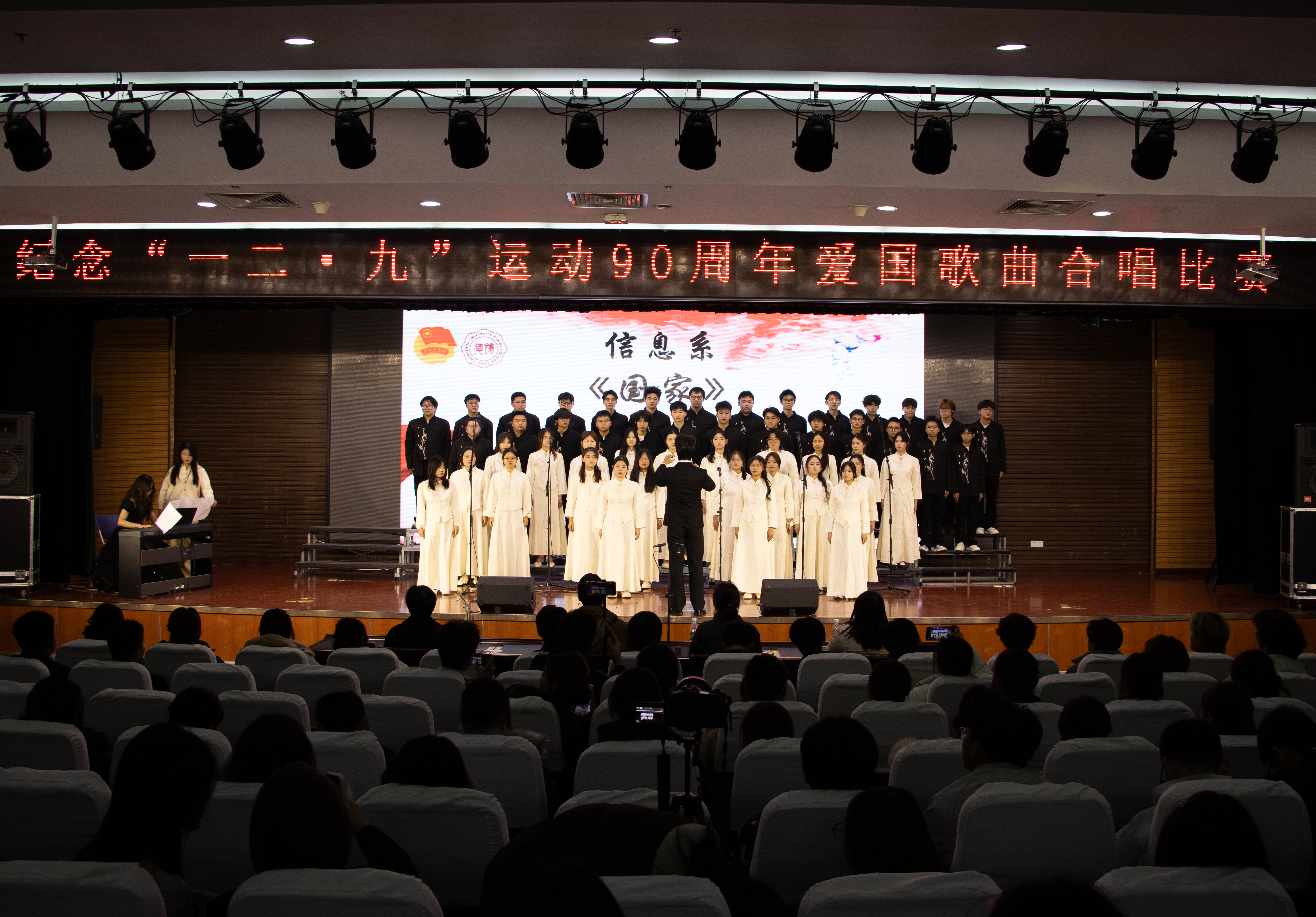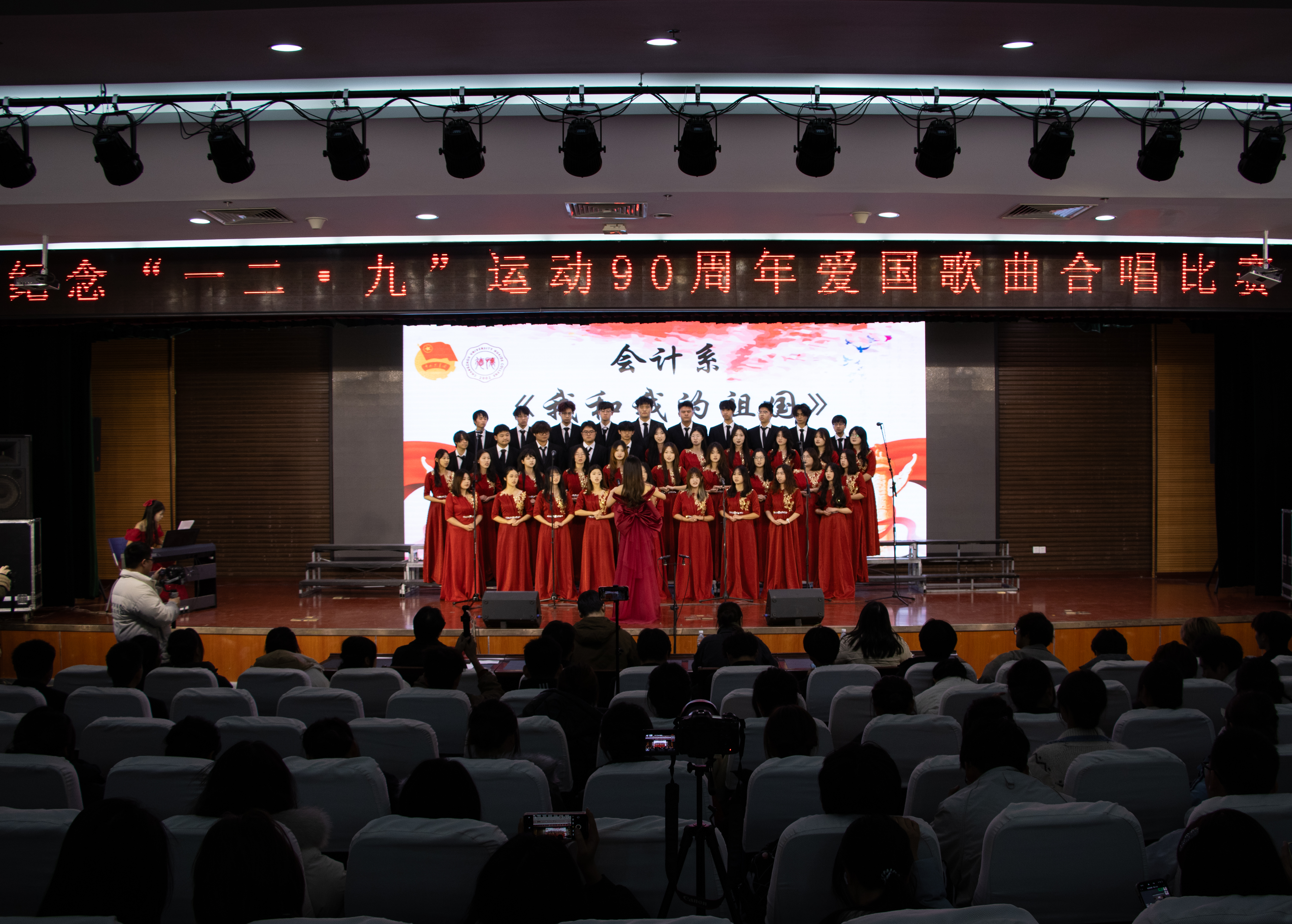 铭记历史,歌唱祖国。为深入学习贯彻习近平新时代中国特色社会主义思想,大力弘扬爱国主义精神,2025年12月9日晚,由共青团常州大学怀德学院委员会主办的“一二•九”运动90周年爱国歌曲合唱比赛在怀德楼报告厅顺利举行。 此次比赛得到了全院师生的积极响应和广泛参与。来自我院七个系的合唱队伍齐聚一堂,用嘹亮歌声缅怀历史。担任本次活动评委的嘉宾有:上海暄愚文化传媒有限公司创始人、音乐制作人周智文,上海市长宁区文化指导员、青年指挥赵艾伦,靖江市音乐家协会会员刘峥及团学指导老师王杨一可。 各队伍依次上台,演唱了《国家》、《我和我的祖国》、《我爱你中国》、《没有共产党就没有新中国》、《复兴的力量》、《灯火里的中国》和《万疆》。这些耳熟能详的旋律在厅内久久回荡,唱出了新时代青年对革命先烈的深切缅怀、对祖国繁荣昌盛的自豪之情,展现了当代大学生奋发有为、昂扬向上的精神风貌。真挚感情抒发无限热爱,铿锵歌声演绎爱国歌曲。 经过评委老师专业的评分,最终,经济管理系荣获一等奖,外语系、信息工程系获得二等奖,建筑与环境工程系、艺术系、会计系、机械与材料工程系获得三等奖。 本次活动不仅是一场艺术盛会,更是一次深刻的爱国主义教育。广大学子应坚定理想信念,增强历史责任感与使命感,要将爱国热情化为实际行动,为实现中华民族伟大复兴的中国梦贡献青春力量。(通讯员/王杨一可 审核/谷灵莉)