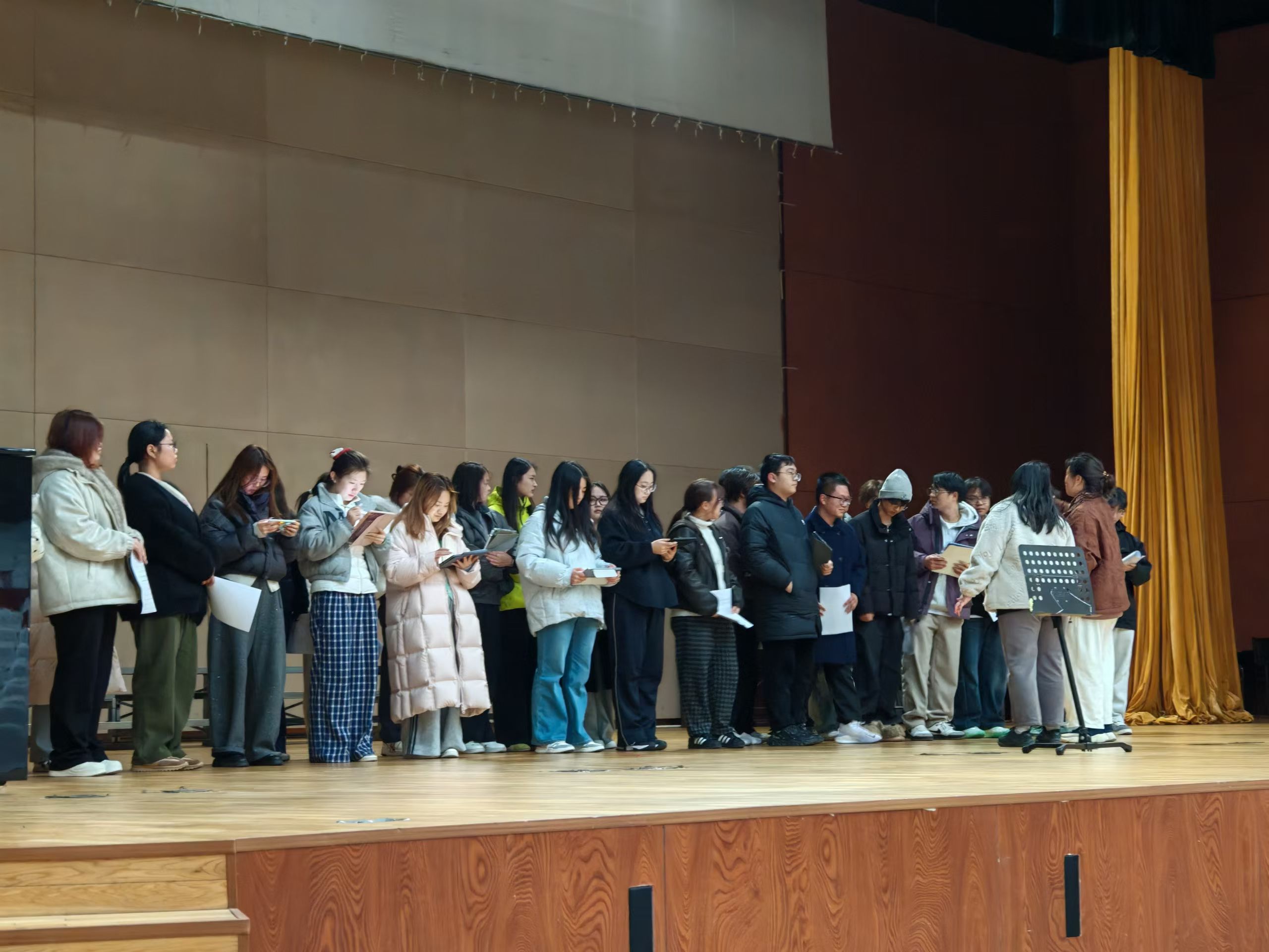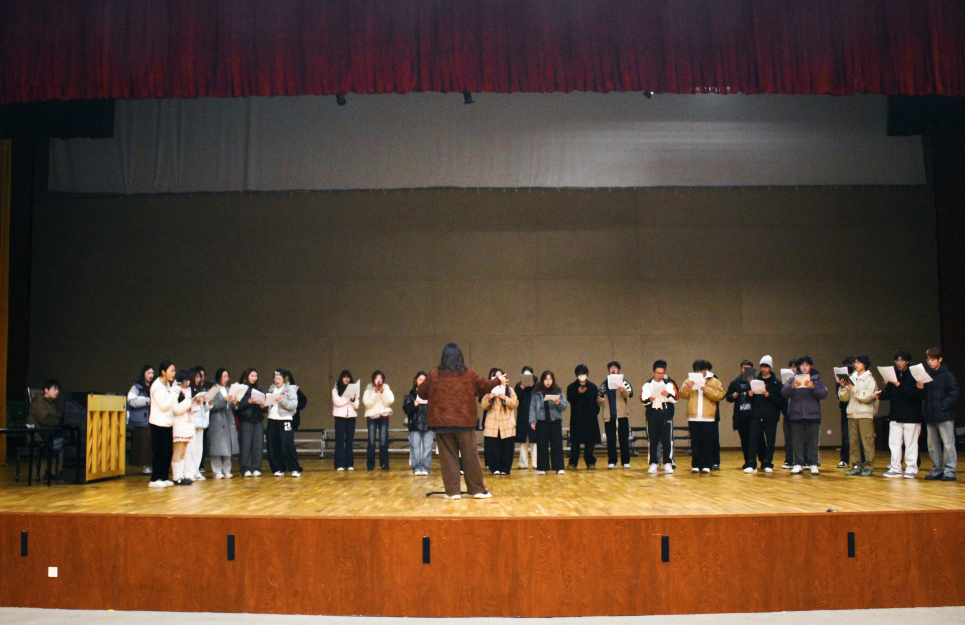 为全力备战省第八届大学生艺术展演,本学期,我院合唱团于大礼堂启动常态化、系统性集中训练。训练由院团委王杨一可,上海市长宁区文化指导员、青年指挥赵艾伦,上海暄愚文化传媒有限公司创始人、音乐制作人、钢琴艺术指导周智文联合悉心指导,全体团员以饱满的精神状态全情投入,在反复打磨中精进合唱技艺,凝聚团队合力。 本次训练严格遵循科学的合唱教学体系,层层推进夯实演唱功底。训练以基础练声为起点,指导老师带领团员开展规范的气息控制与音准训练,筑牢合唱表演的基本功底;核心环节围绕一首四声部混声合唱作品展开,指挥先进行分声部精细化排练,再组织多轮全团合排,从音色融合、声部平衡到情感表达逐一细致打磨,引导团员深刻领会作品内涵,提升表演的艺术感染力;最后通过视唱练耳专项训练,针对节奏、音高及多声部听觉展开强化练习,有效提升了团员的音乐感知力、读谱能力与多声部协作的灵敏性,为挑战高难度曲目做好充分能力储备。 我院合唱团始终坚守以美育人、以文化人的育人宗旨,将日常训练作为提升团队专业水平与凝聚力的核心抓手。此次系统性备赛训练,不仅锤炼了团员们的专业演唱技能,更彰显出他们精益求精的艺术追求与团结协作的奉献精神。下一步,合唱团将继续潜心打磨作品、精研表演细节,力争在省大学生艺术展演的舞台上展现我院学子的青春风采与艺术素养,为院争光。(通讯员/王杨一可 审核/谷灵莉)