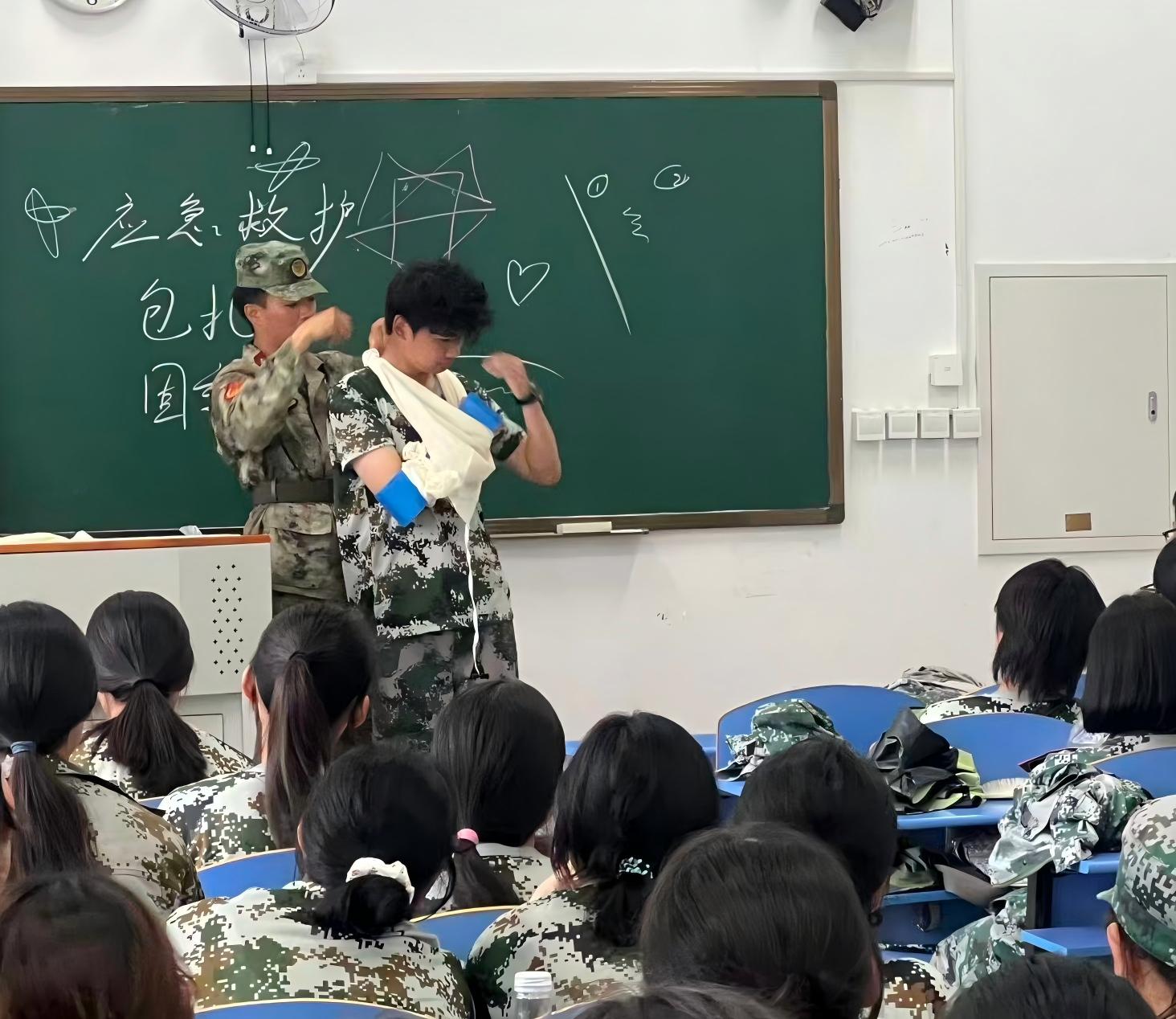 为普及应急救护知识,提升学生在突发事件中的自救互救能力,9月25日,院人武部组织2025级全体新生开展战场医疗救护培训,靖江市人武部军训教官受邀指导。