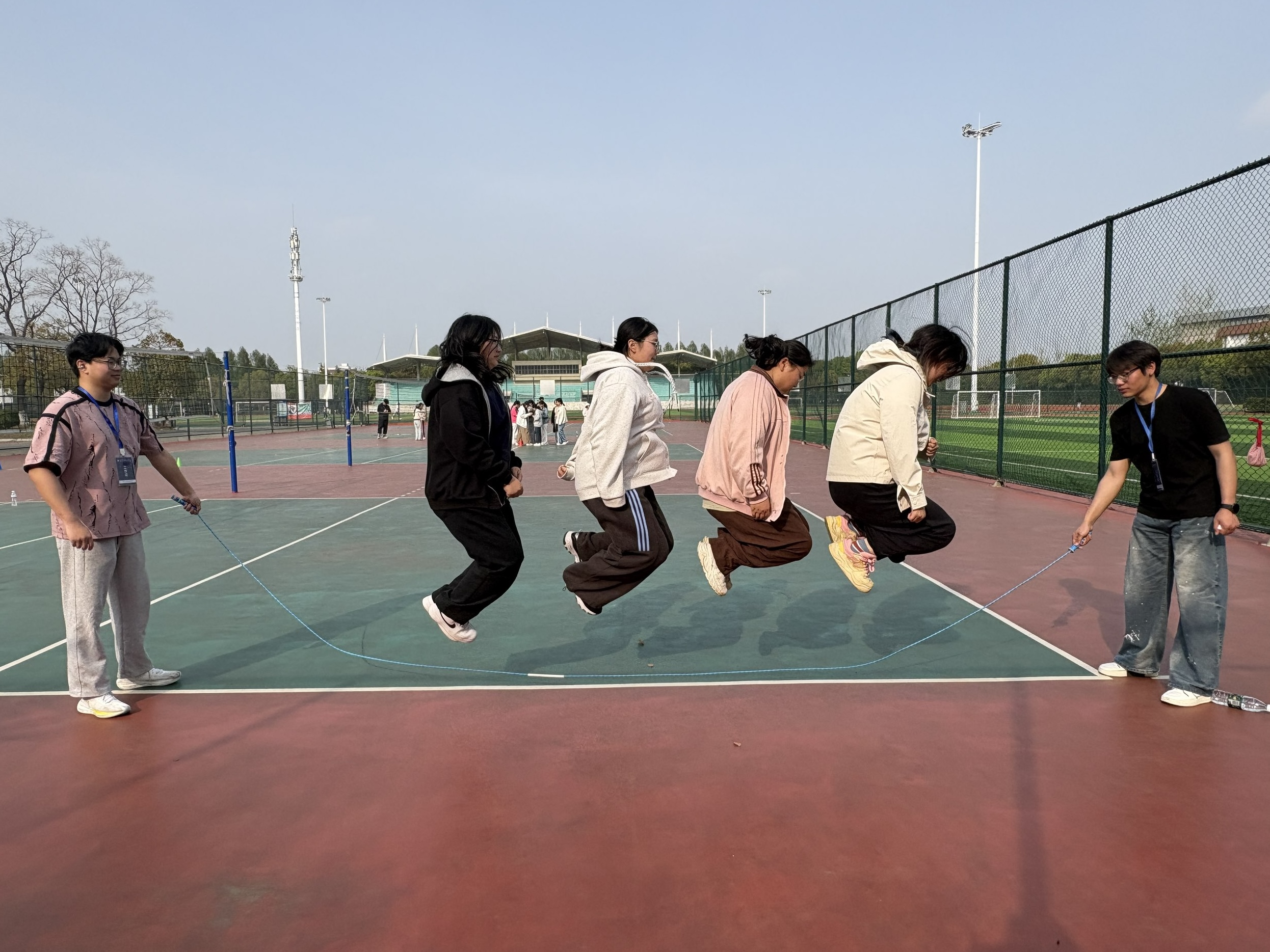 本次活动设置了“绳舞飞扬”、“同心并行”、“不倒森林”和“轨道传球”四个项目,兼具协作性与趣味性。同学们自行组建四人小队,依次进行挑战。活动现场气氛热烈,队员们默契配合,展现出青春的活力与并肩前行的温情。