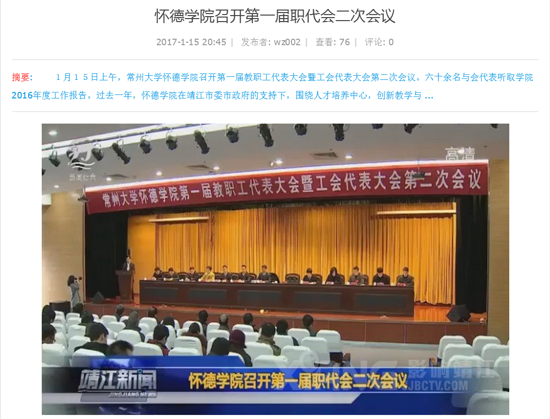 1月15日上午,常州大学怀德学院召开第一届教职工代表大会暨工会代表大会第二次会议。六十余名与会代表听取学院2016年度工作报告。过去一年,怀德学院在靖江市委市政府的支持下,围绕人才培养中心,创新教学与管理,加强内涵建设,推进二期工程建设。新的一年,怀德学院将继续团结全体教职工,不忘初心,开拓创新,将怀德学院建设成为质量优良、特色鲜明的应用型大学。