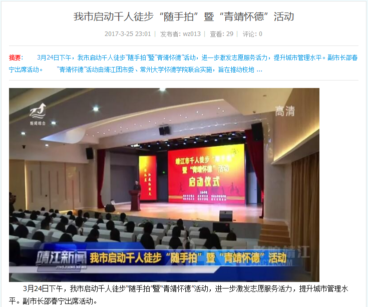 靖江市千人徒步“随手拍”活动由市文明办、团市委、怀德学院、市总工会、市妇联、市迎检办联合举办,活动以周为单位共举办10次,每次活动都有100名以上志愿者参与,共计1000人参加。活动过程中,参与者将以公益徒步、随手拍、义务劳动有机结合的形式宣传文明城市理念,并用随手拍的方式寻找捕捉城市管理中存在的问题和漏洞,经活动组织方筛选后提供至相关职能部门及时整改;同时,在徒步拍摄的过程中,每名参与者也会用随身携带的垃圾袋将沿途的垃圾、杂物及时清理打包至统一回收处。