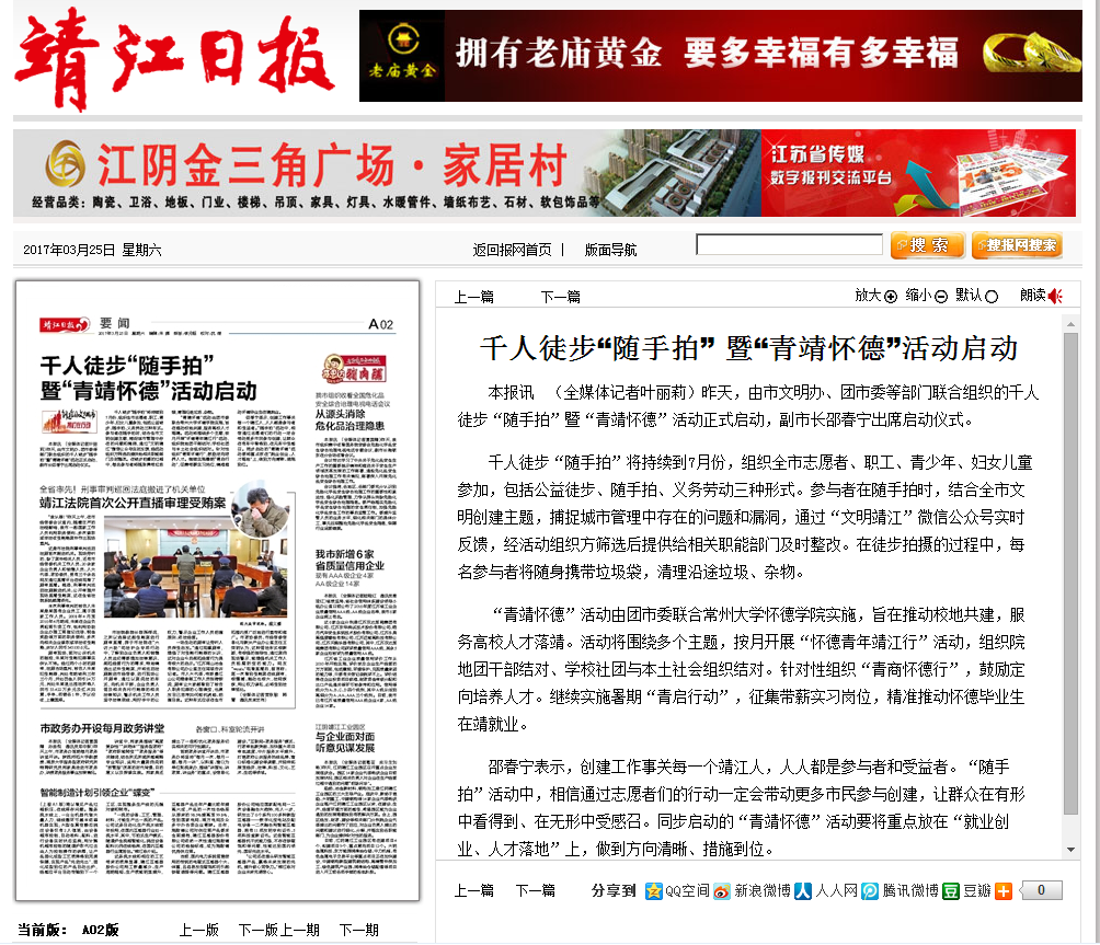 邵春宁表示,创建工作事关每一个靖江人,人人都是参与者和受益者。“随手拍”活动中,相信通过志愿者们的行动一定会带动更多市民参与创建,让群众在有形中看得到、在无形中受感召。同步启动的“青靖怀德”活动要将重点放在“就业创业、人才落地”上,做到方向清晰、措施到位。