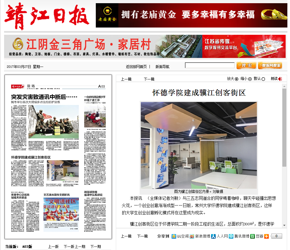 骥江创客街区位于怀德学院二期一阶段工程的生活区,总面积约300㎡,是怀德学院创业街的一部分。其中设置了分享区、沙龙区、小型会议室等多个功能区域,各区域配置了电脑、休闲桌椅等设施,整体环境宽松休闲。怀德学院团委书记阴祥介绍,创客街区启动建设初期,学院就面向全体大学生广发“英雄帖”,征集创业项目。经过评审,目前共有11个项目即将进驻创客街区,包括广告设计、影视传媒、公益服务、创意产品销售、电子科技产品研发等。
