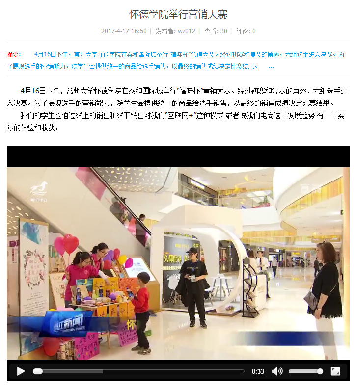 4月16日下午,常州大学怀德学院在泰和国际城举行“福味杯”营销大赛。经过初赛和复赛的角逐,六组选手进入决赛。为了展现选手的营销能力,院学生会提供统一的商品给选手销售,以最终的销售成绩决定比赛结果。