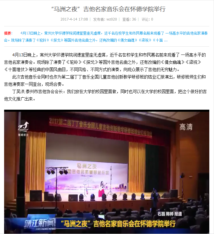 4月13日晚上,常州大学怀德学院润德堂里座无虚席,近千名在校学生和市民慕名前来观看了 一场高水平的吉他名家演奏会。现场除了演奏了《驼铃》《探戈》等国外吉他名曲之外,还有改编的《倩女幽魂》《梁祝》《十面埋伏》等经典的中国风曲目,不同风格、不同方式的演奏,向观众展示了吉他的无穷魅力。
