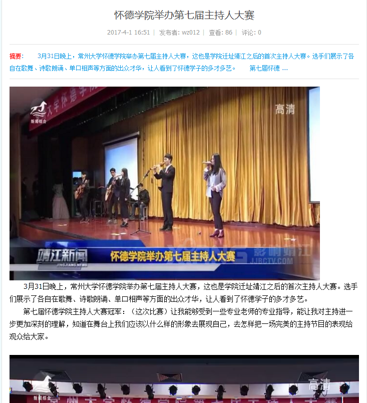 3月31日晚上,常州大学怀德学院举办第七届主持人大赛,这也是学院迁址靖江之后的首次主持人大赛。选手们展示了各自在歌舞、诗歌朗诵、单口相声等方面的出众才华,让人看到了怀德学子的多才多艺。