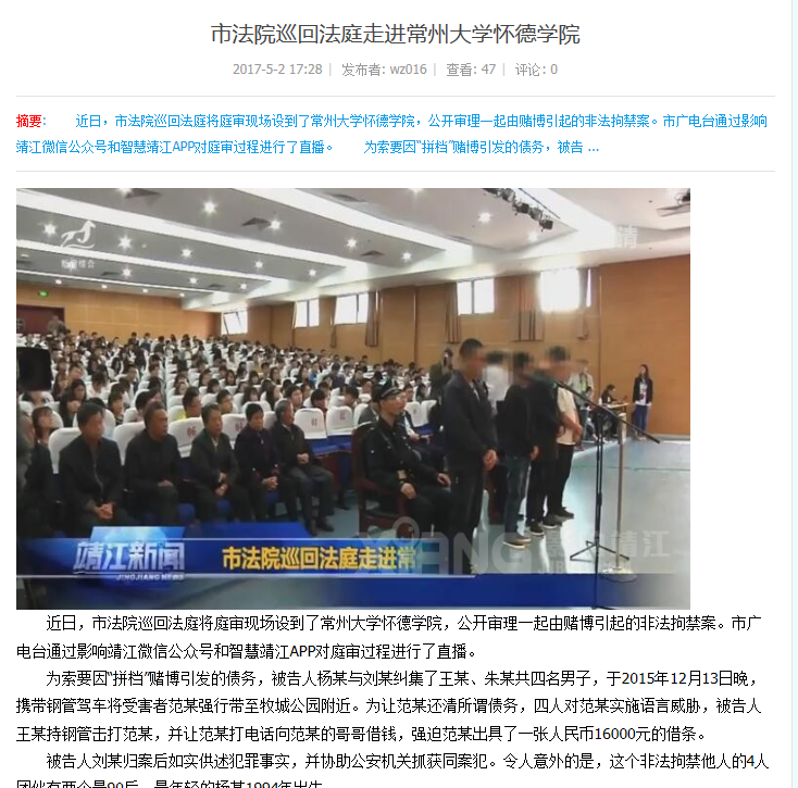 近日,市法院巡回法庭将庭审现场设到了常州大学怀德学院,公开审理一起由赌博引起的非法拘禁案。市广电台通过影响靖江微信公众号和智慧靖江APP对庭审过程进行了直播。