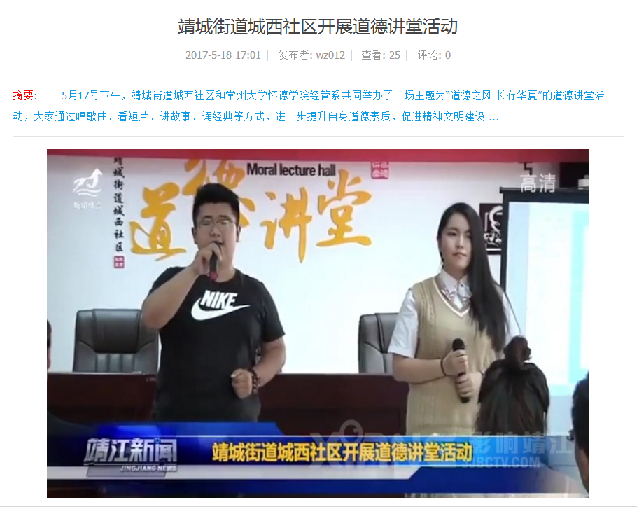 5月17号下午,靖城街道城西社区和常州大学怀德学院经管系共同举办了一场主题为“道德之风 长存华夏”的道德讲堂活动,大家通过唱歌曲、看短片、讲故事、诵经典等方式,进一步提升自身道德素质,促进精神文明建设。活动中,大学生们还发起倡议,号召大家自觉养成良好的道德风尚,努力成为道德风尚的传播者和实践者。