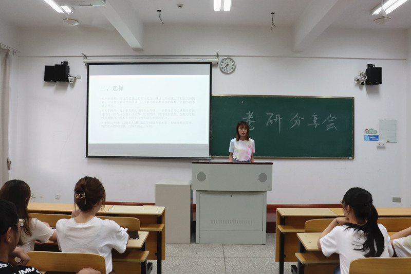 分享会上,韩文雯和王宇彤结合自身经历与同学们分享了自己的考研经验。对于如何做好考研准备,她们分别从选择院校、专业、初试科目复习安排,经验与教训以及考研资料推荐等方面进行详细的讲解,帮助同学们了解考研的一些基本事项,并给出建议,在分享会上同学们收获颇多。
