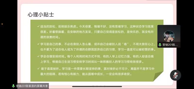 活动中,陈紫苗首先提出“正确看待'异类'的自己”,“建立友爱同学情”,“建立良好的学习心态”,“常思念家人好友”,“树立正确的爱情观”五个部分,然后逐一提出了相应的正确做法。最后陈紫苗呼吁大家拒绝焦虑,合理安排时间,敢于直面挫折。