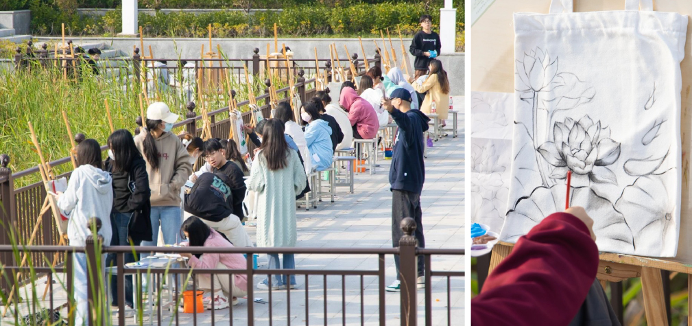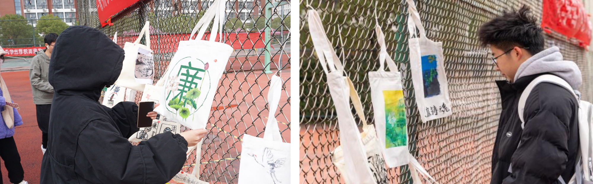 11月30日,由评委打分进入展示环节的40份帆布包设计作品在网球场进行展演评选。评选过程中,一幅幅精美的帆布包画作吸引了大量师生驻足参观。学生党员工作站的工作人员热情地介绍作品的内容和涵义,现场氛围十分热烈。同学们纷纷为自己喜爱的帆布包投上了宝贵一票。大赛结合评委打分、现场投票,最终评选出一等奖4组,二等奖6组,三等奖9组,优秀奖若干名。
