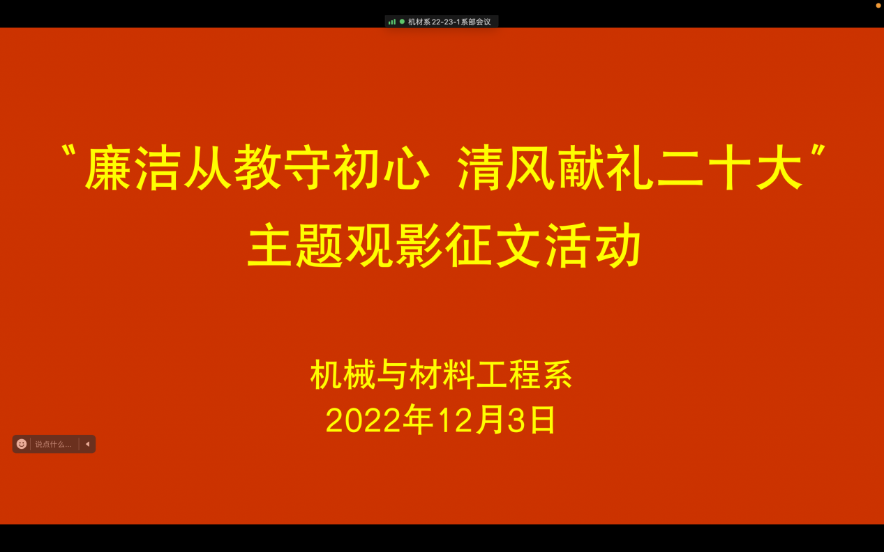 为深入贯彻落实《中共中央关于认真学习宣传贯彻党的二十大精神的决定》,引导广大教职工把力量凝聚到党的二十大确定的各项任务上来,进一步营造尊师重教的浓厚氛围。12月3日-14日,机械与材料工程系开展“廉洁从教守初心 清风献礼二十大”主题的观影征文活动。