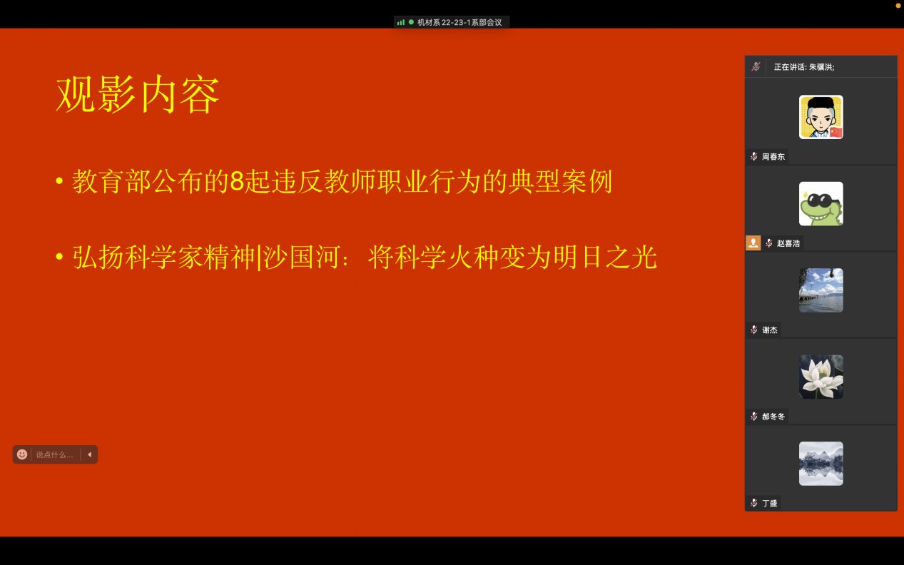 12月3日下午,机械与材料工程系党总支组织系部全体教师线上会议集中观看了《教育部公布的8起违反教师职业行为准则典型案例》和《弘扬科学家精神-沙国河:将科学火种变为明日之光》两段教育视频,系部教师轮流畅谈了学习感悟,纷纷表示在今后的教学工作中将严格规范职业行为,将科学家精神发扬传承。12月4日-12月10日,系部教师围绕党的二十大精神,以“廉洁从教守初心”为重点,以立德树人成效为导向,结合两段教育视频撰写心得体会,畅谈立德树人的责任感和使命感,表达爱党爱国情怀。12月14日,经过评委打分,最终选出来一等奖1项,二等奖2项,三等奖3项,优秀奖若干名。