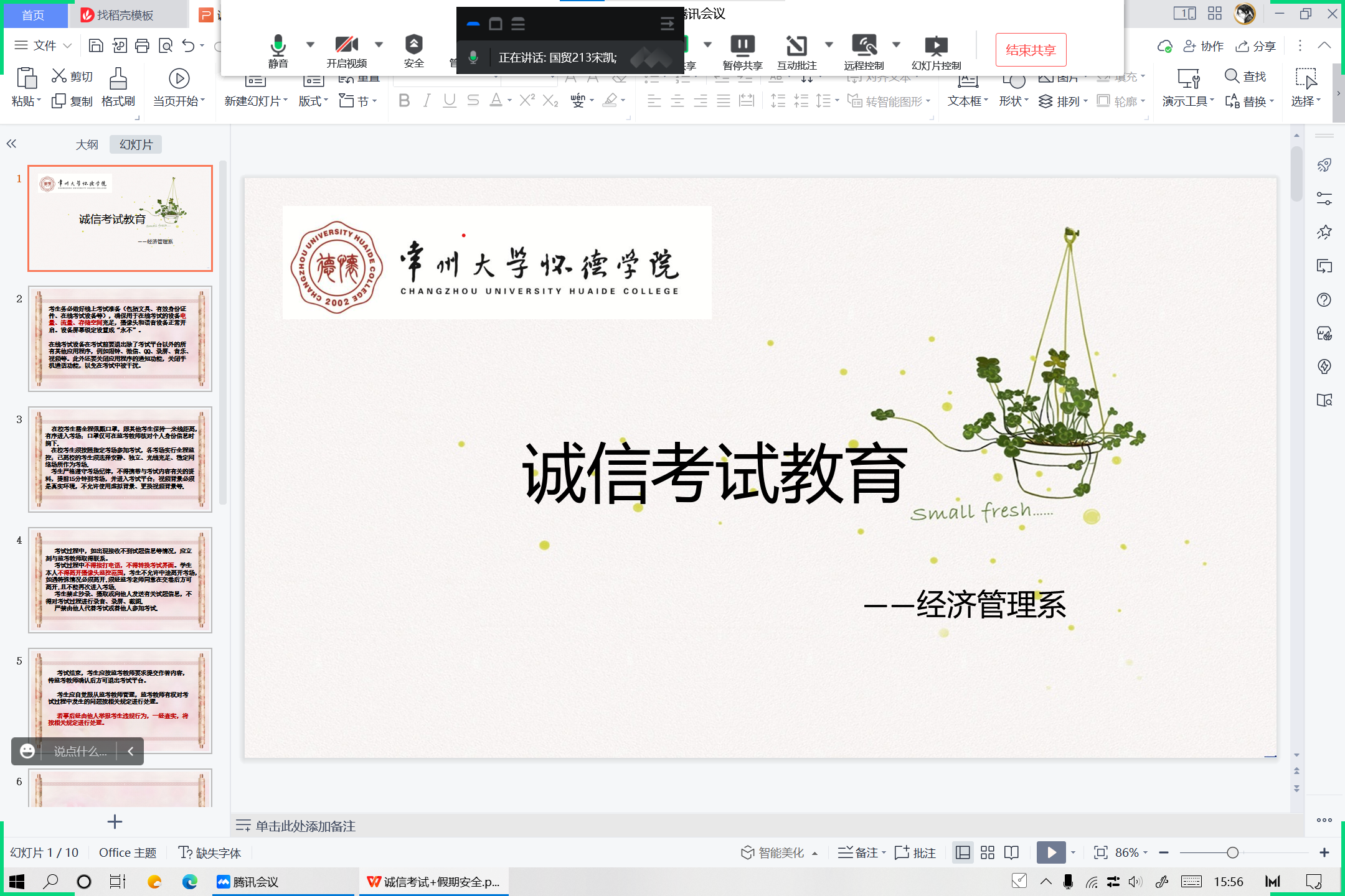 为严肃考风考纪,加强大学生的期末考试诚信教育,12月14日,经济管理系于线上召开诚信考试教育会议,会议由各带班辅导员主讲,经管系全体学生参与。