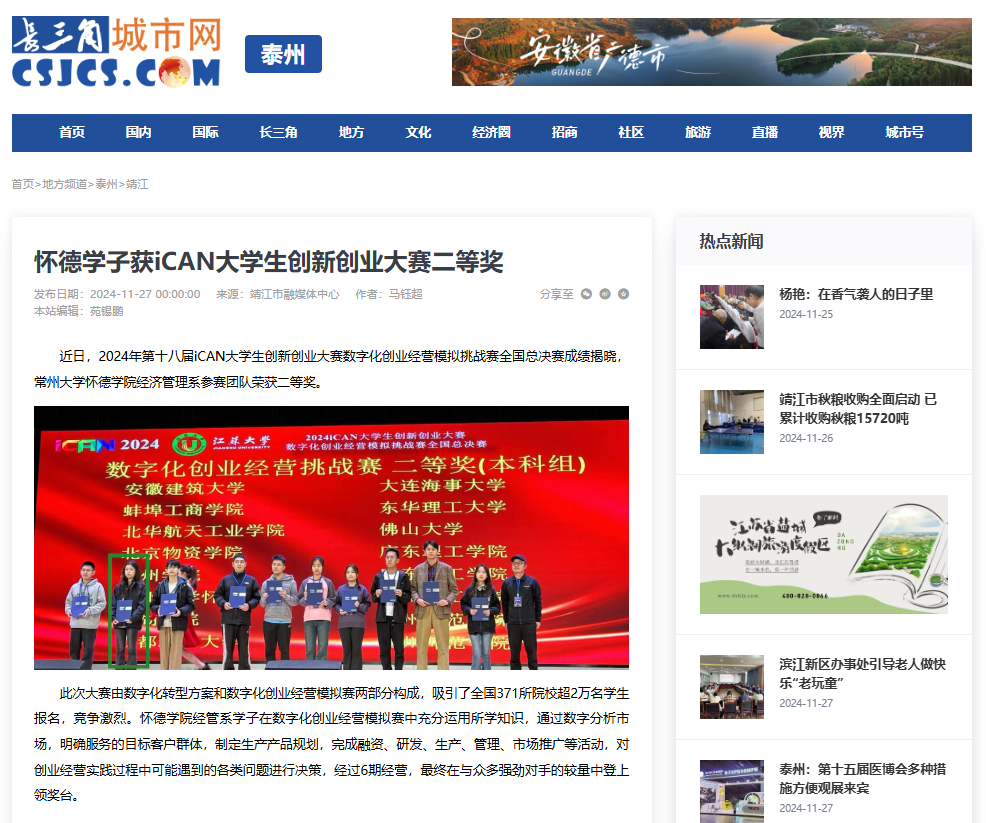 【长三角城市网】怀德学子获iCAN大学生创新创业大赛二等奖