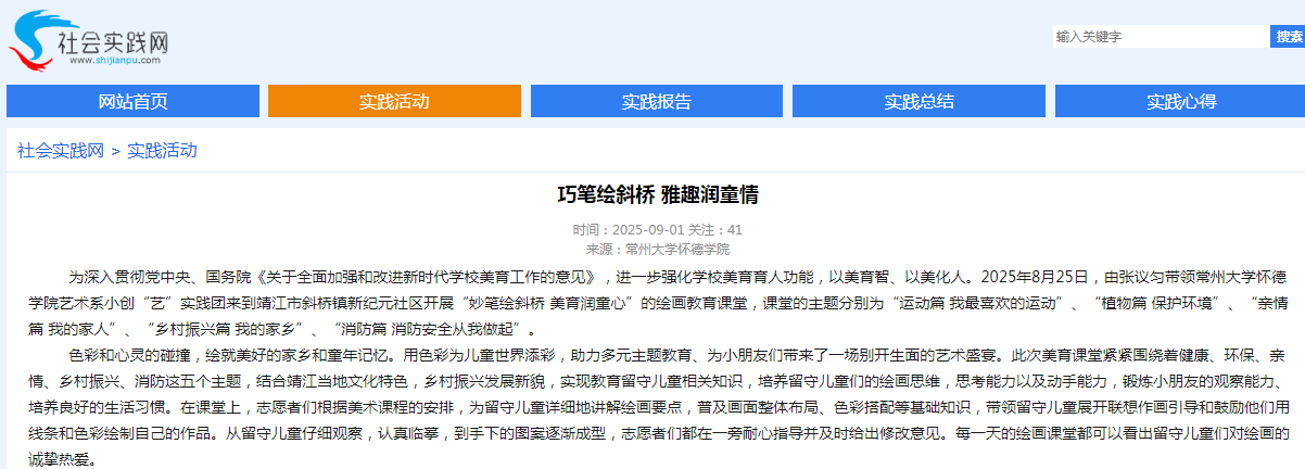 为深入贯彻党中央、国务院《关于全面加强和改进新时代学校美育工作的意见》,进一步强化学校美育育人功能,以美育智、以美化人。2025年8月25日,由张议匀带领常州大学怀德学院艺术系小创“艺”实践团来到靖江市斜桥镇新纪元社区开展“妙笔绘斜桥 美育润童心”的绘画教育课堂,课堂的主题分别为“运动篇 我最喜欢的运动”、“植物篇 保护环境”、“亲情篇 我的家人”、“乡村振兴篇 我的家乡”、“消防篇 消防安全从我做起”。