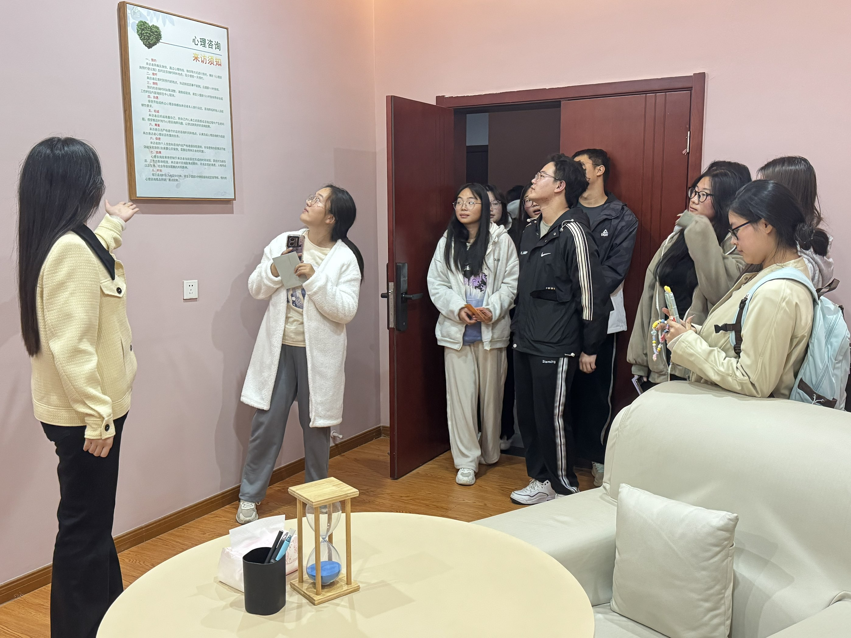 在心理健康教育与研究中心刘佩佩老师的带领和讲解下,心理委员们依次参观了心理辅导室、个体咨询室、沙盘游戏室等多个功能区域,系统了解了各区域的功能定位、使用规范及心理咨询预约流程。