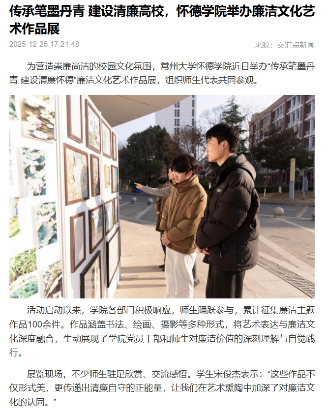 为营造崇廉尚洁的校园文化氛围,常州大学怀德学院近日举办“传承笔墨丹青 建设清廉怀德”廉洁文化艺术作品展,组织师生代表共同参观。