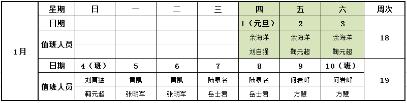 2026年1月值班安排