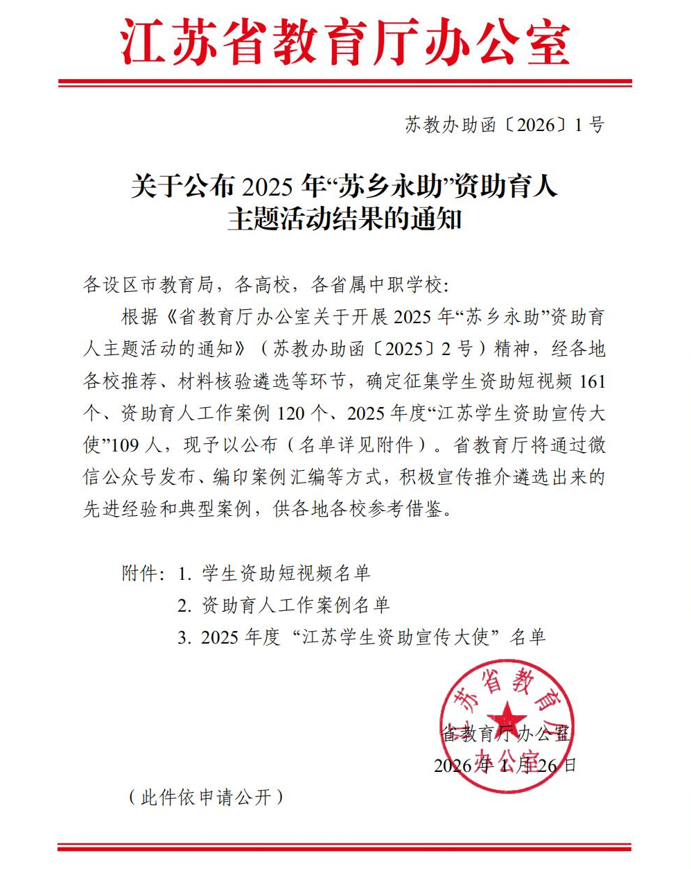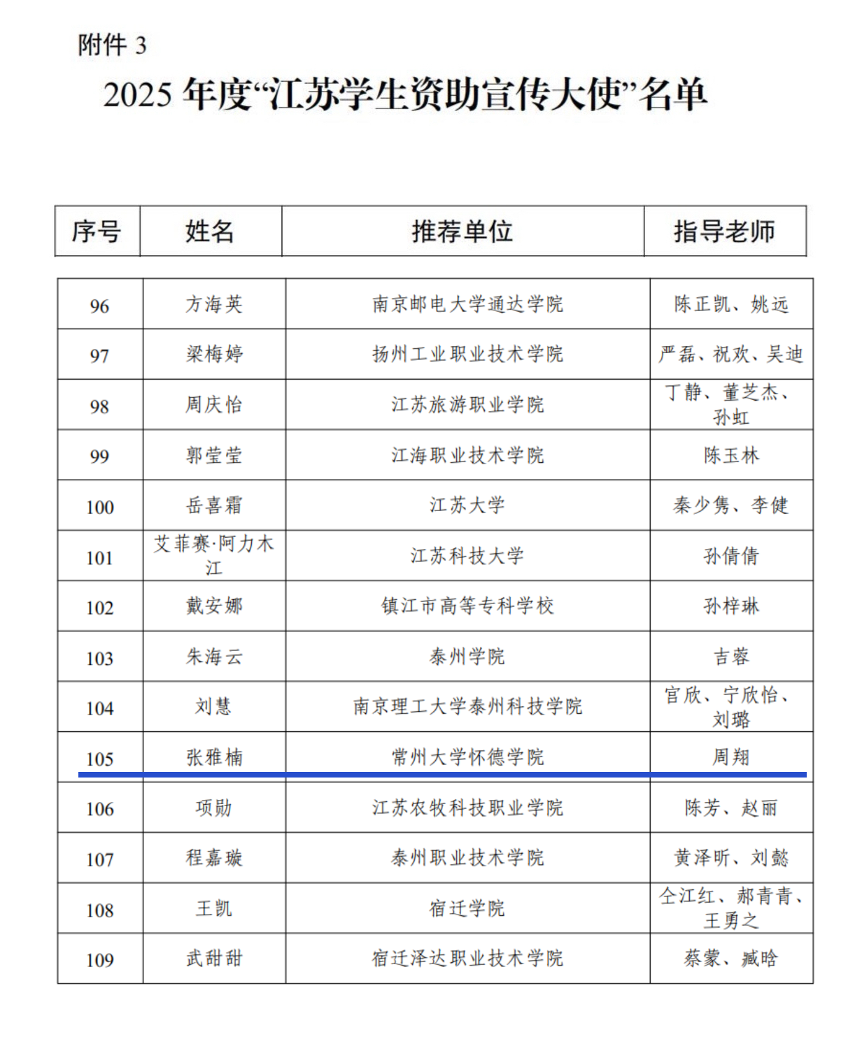 近日,江苏省教育厅办公室印发《关于公布2025年“苏乡永助”资助育人主题活动结果的通知》,我院张雅楠同学成功获评江苏省“资助宣传大使”。