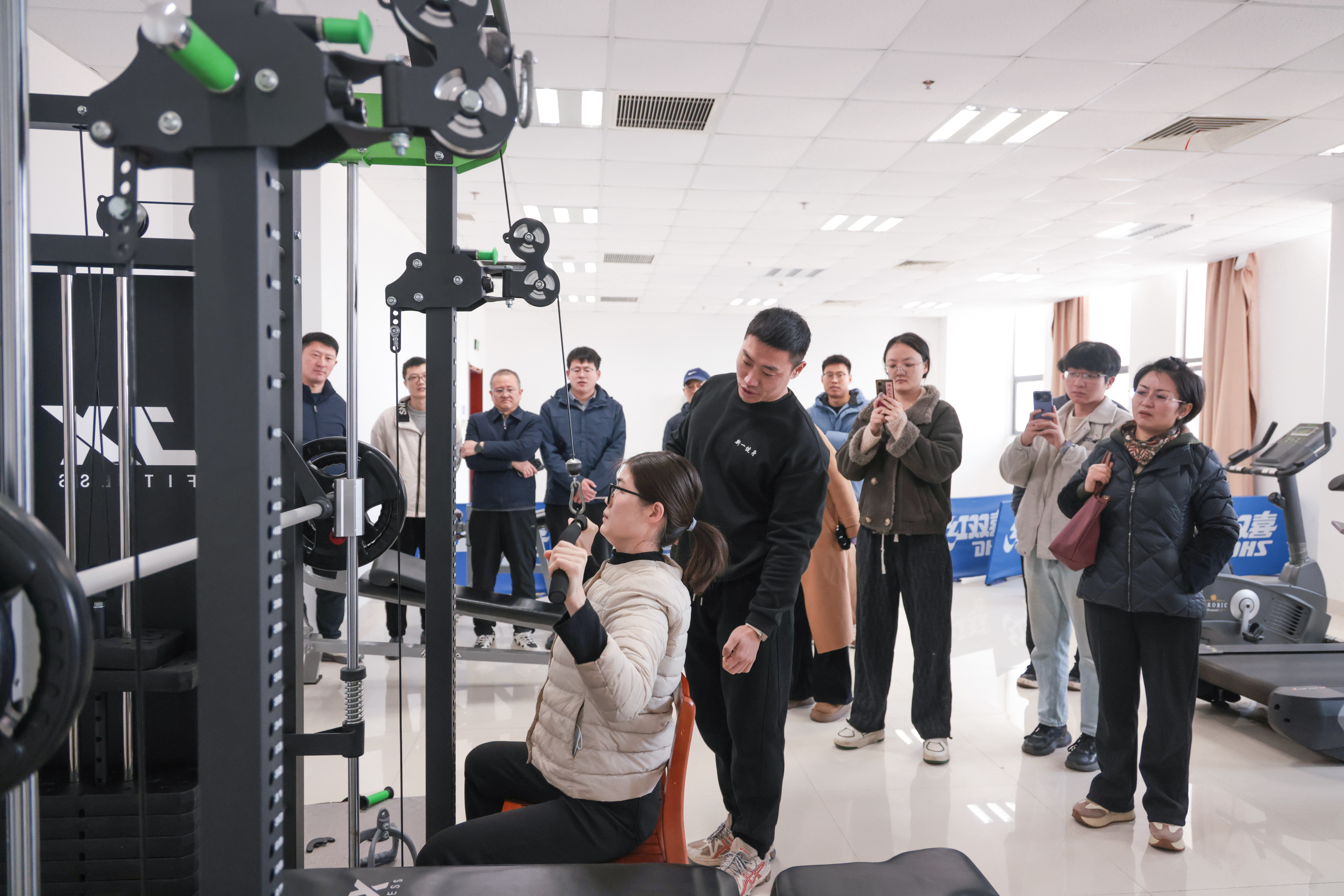 理论讲解结束后,实操教学环节在学院健身房开展。闵瑞现场示范各类健身器材的标准操作流程、发力技巧与安全注意事项,针对不同器材的功能特点、适用人群逐一讲解,并耐心为教职工提供一对一指导。参与教职工热情高涨积极体验,在专业指导下纠正动作、规范姿势,切实感受科学锻炼的独特魅力,现场氛围轻松热烈、互动频频。